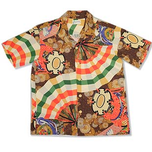 日本に古くから伝わる神事のひとつに、御神楽(みかぐら)と呼ばれる神に奉納するための歌舞がある。この作品は、御神楽で使われる扇子や鼓(つづみ)などが豪華に描かれた珍しいデザイン。これらのモチーフは和柄のアロハシャツに度々使われるが、本作では鼓を縛るための調緒(しらべお)と呼ばれる麻で作られた紐を差し色のアクセントとし、華やかさが光る一枚となっている。 ● Made in JAPAN |